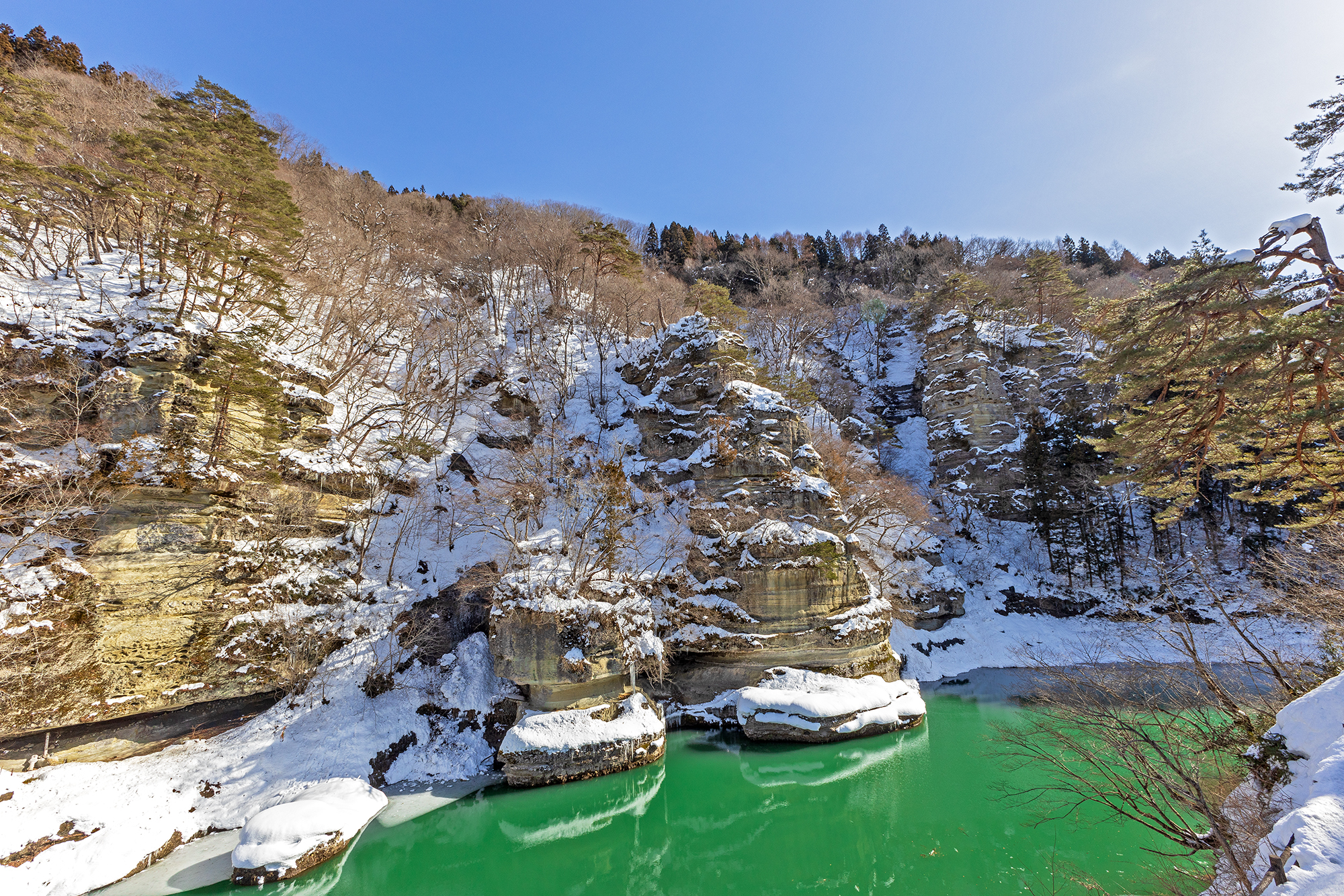 塔のへつりは、奇岩怪石が塔のように並ぶ渓谷の景勝地で、国の天然記念物にも指定されています。冬になると岩肌や周囲の木々に雪が積もり、渓谷の荒々しい地形と白い雪景色が重なった独特の風景を見ることができます。雪に包まれた奇岩群や渓谷の景観は、ほかの季節とは異なる静かな魅力があります。冬ならではの厳しい自然がつくり出す景色を楽しめる、下郷町を代表する観光スポットのひとつです。